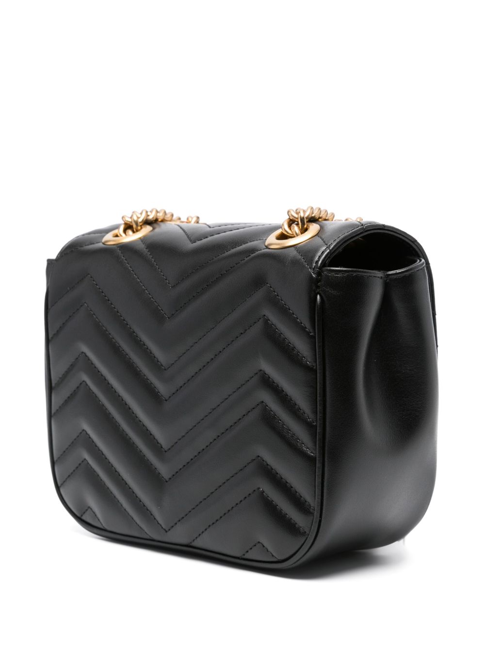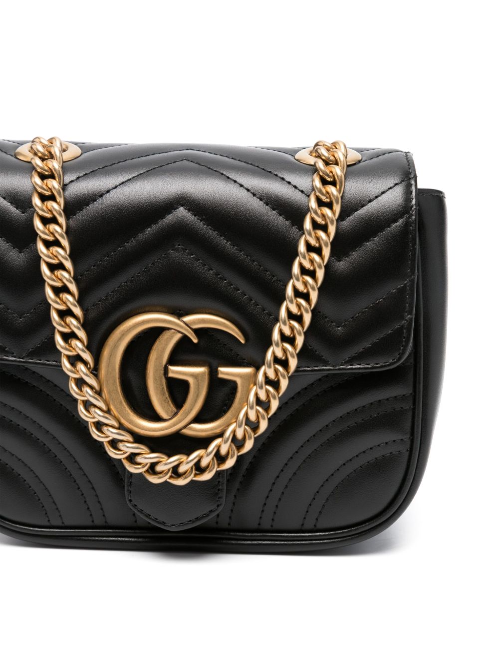 Gucci scales down its signature GG Marmont shoulder bag to mini proportions. This black iteration features chevron matelassé quilting and is topped with the brand's Double G gold-tone logo plaque.
